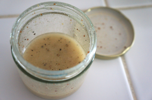 I always use extra-virgin olive oil in my balsamic vinaigrette, but the Northstar vinaigrette definitely uses a lighter, more neutral oil. Grapeseed oil works very well. A dab of mustard and honey (both good for emulsion) and a bit of water to dilute the sharpness of the vinegar. Salt, pepper and garlic if you have it handy. Whisk in a bowl or shake it up in a jar.