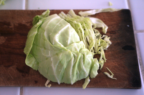 - Cut cabbage in half and place cut-side down on cutting board. Slice as thinly as possible enough cabbage to equal 1/4 to 1/2 of your volume of greens. Add to bowl with greens.
