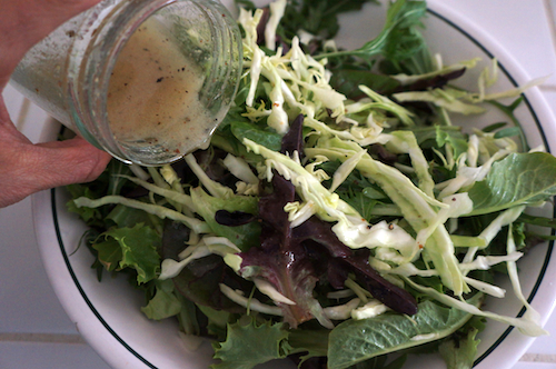 - Slowly add dressing to salad, mixing and tasting, until greens are well dressed. Refrigerate any leftover dressing.